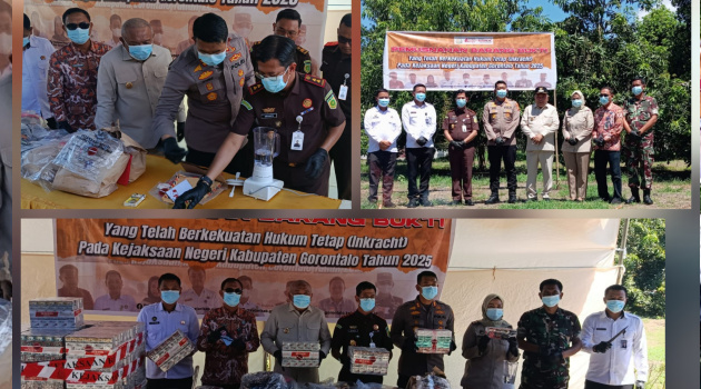 Prosesi pemusnahan yang berlangsung di halaman kantor Kejari Kabupaten Gorontalo itu dipimpin langsung oleh Kepala Kejaksaan Negeri Kabupaten Gorontalo, Dr. Abvianto Syaifulloh, serta dihadiri oleh Wakil Bupati Gorontalo Tonny S. Junus, Kapolres Gorontalo AKBP Ki Ide Bagus Tri, dan sejumlah unsur Forum Komunikasi Pimpinan Daerah (Forkopimda).