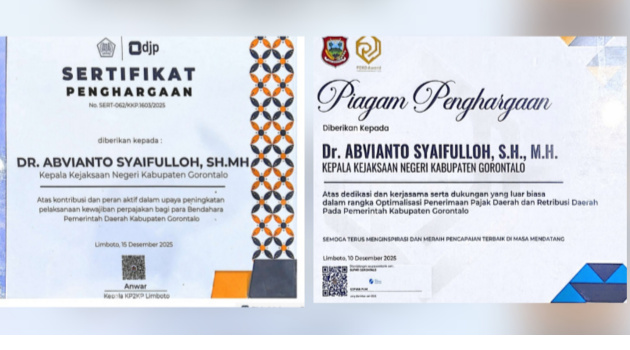LENSA.TODAY, (KABGOR) – Kepala Kejaksaan Negeri Kabupaten Gorontalo, Dr. Abvianto Syaifulloh, S.H., M.H., kembali menorehkan prestasi dengan menerima dua penghargaan atas kontribusi aktif Kejaksaan Negeri Kabupaten Gorontalo dalam mendukung peningkatan kepatuhan perpajakan serta optimalisasi pendapatan daerah.