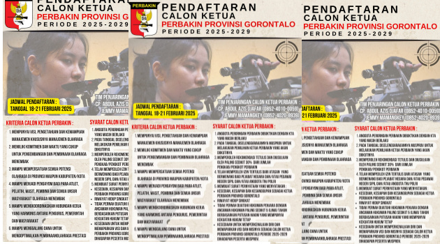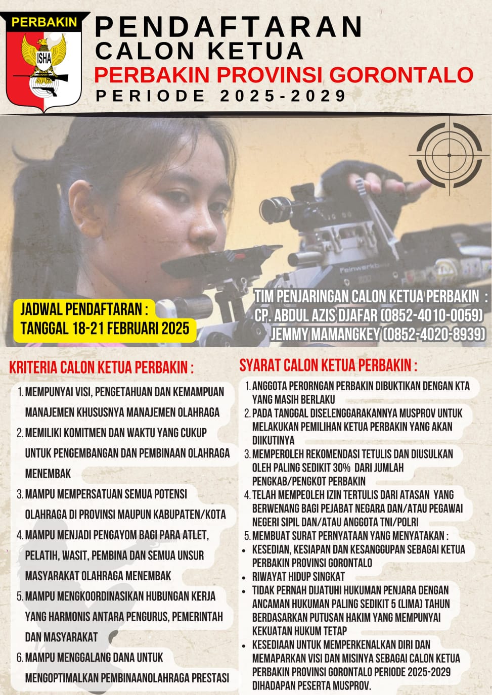 LENSA.TODAY, -(GORONTALO)- Dalam rangka pemilihan Ketua Persatuan Menembak Indonesia (PERBAKIN), Provinsi Gorontalo, Panitia pelaksana membuka Pendaftaran Calon Ketua Periode 2025-2029.