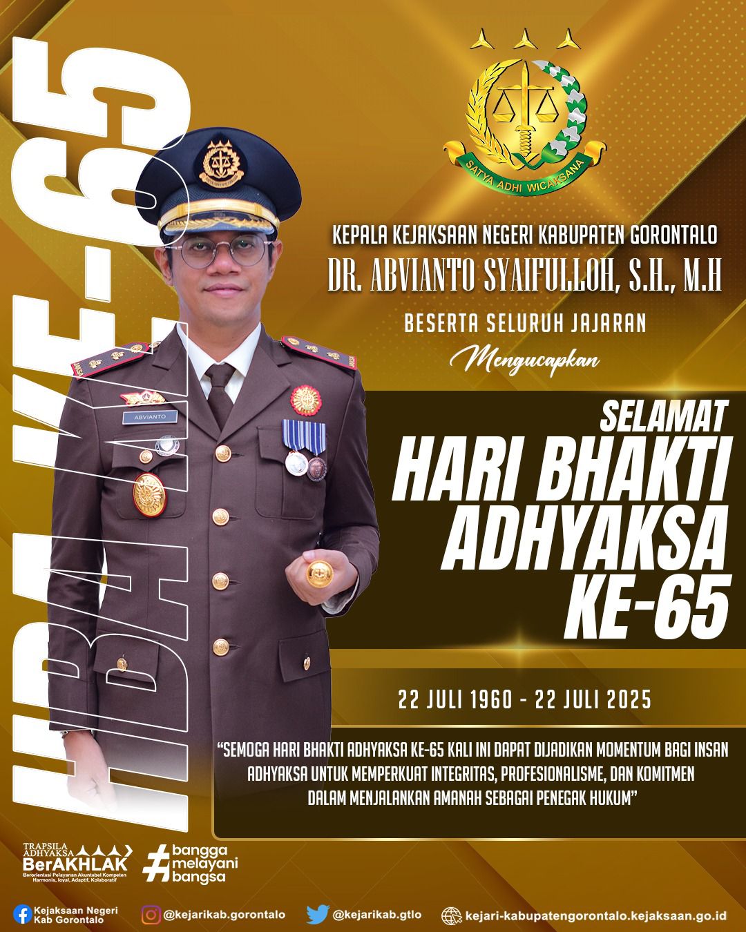 “Semoga Hari Bhakti Adhyaksa ke-65 ini menjadi titik tolak bagi seluruh insan Adhyaksa untuk kembali memaknai tugas dan tanggung jawab sebagai amanah luhur. Di tengah perubahan zaman, hanya integritas dan komitmen yang dapat menjaga marwah penegakan hukum di mata masyarakat,” ujar Dr. Abvianto dengan nada tenang namun penuh ketegasan.